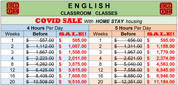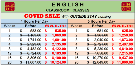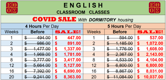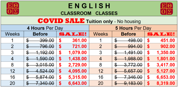 On this page you will find details about pricing and payment for in-person ENGLISH studies here at ETHOS.